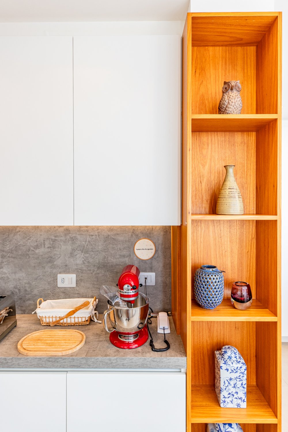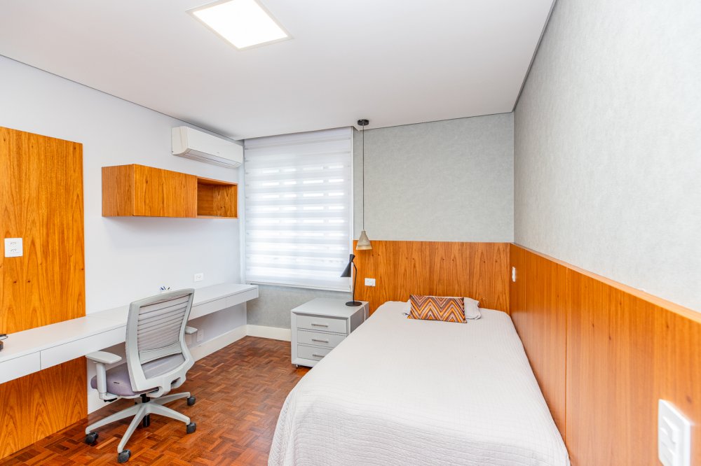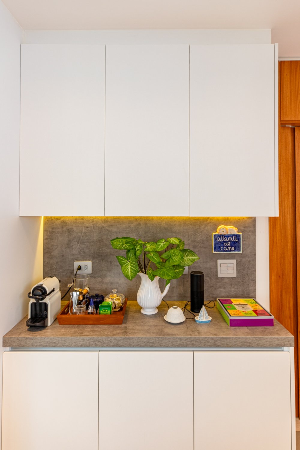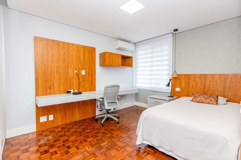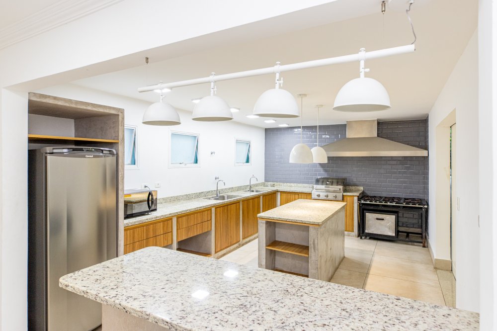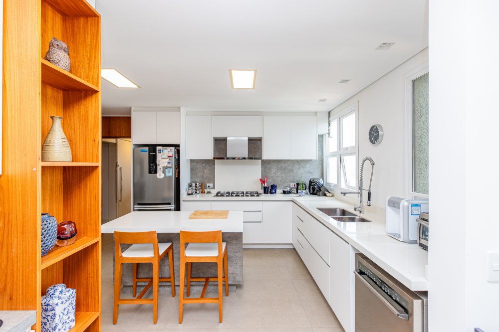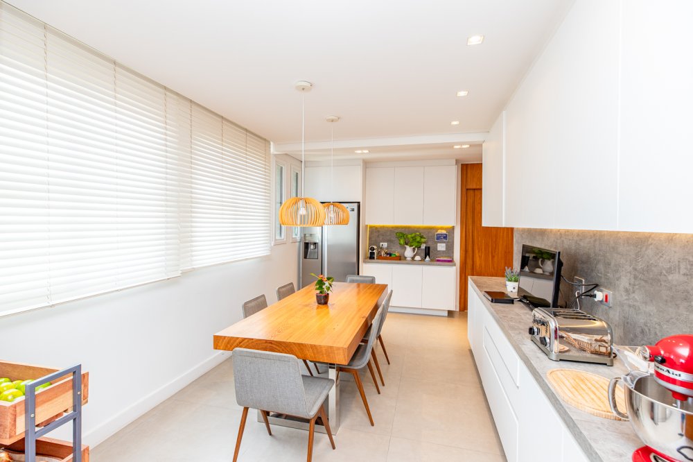 Cozinha equipada com armários planejados de alta qualidade, ventilação natural, lavanderia conveniente e dependência de funcionários atualmente adaptada como escritório.